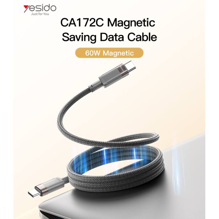 کابل فست شارژ Yesido CA172C Type-C به Type-C با طول 1 متر، توان 60 وات، طراحی مگنتی، روکش الیاف بافته مقاوم و کانکتور فلزی، گزینهای ایدهآل برای شارژ سریع و انتقال اطلاعات است.
